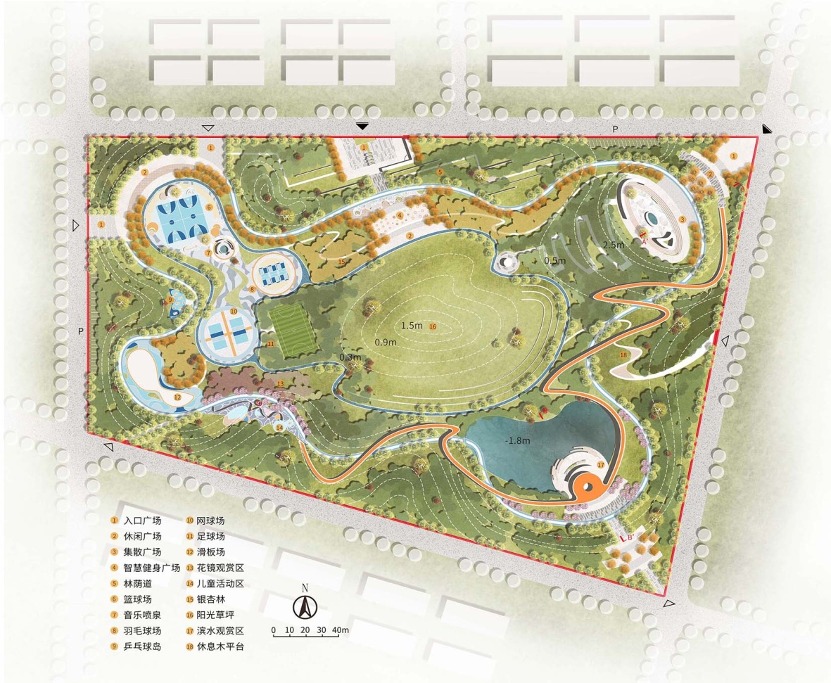 由于不同年龄人群的体育活动需求不同,根据前述人群需求分析,本设计将硬质活动面积的25%分配给中老年康体区,将45%分配给青少年球类运动空间,实现资源配置与人口结构的精准匹配。进行如下总体布局: