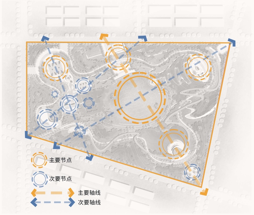 景观结构为“四轴多点”状,其中主轴为“入口广场–阳光草坪–滨水观赏”,三条次轴分别为“集散广场–阳光草坪–芳香花镜”“篮球场–羽毛球场–儿童活动”和“智慧广场–羽毛球场–滑板区”,共同串联起公园的各个节点(图7)。