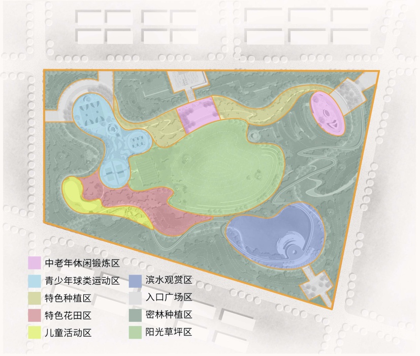 该设计将场地划分为九个活动区,分别是:儿童活动区、青少年球类运动区、中老年休闲锻炼区、滨水观赏区、特色种植区、特色花田区、入口广场区、密林种植区、阳光草坪区,以满足居民的健康、体育、休闲、观赏需求等(图8)。