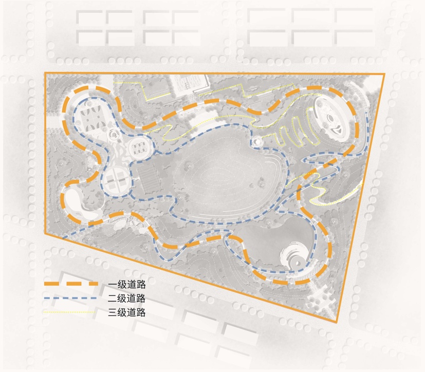 该场地占地面积约14公顷,规划设计三级道路。一级道路宽为4.5米,作为公园内的交通主干道,连接主要出入口、核心景点、功能区,引导人流集散,同时承担消防、应急救援等功能性通行需求。二级道路宽为2.5米,串联一级道路与三级道路,分流主园路人流,引导游客进入次要景点,在设计中作为智慧跑道供居民进行体育锻炼活动。三级道路宽为1.5米,深入公园各个角落,连接次要景点与微观景观,满足游客近距离观赏、休憩的需求,营造静谧的游览体验(图9)。