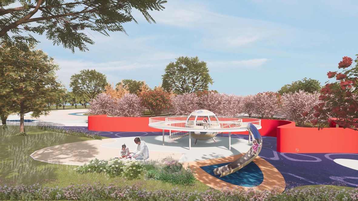 儿童活动区采用环保橡胶地面,激发色彩感知;游乐设施区配备螺旋滑梯与低龄友好型缓坡滑梯;植物科普展示墙以卡通浮雕与触摸感应屏结合,打造安全、趣味与教育并重的成长空间;半开放式凉亭配备亲子互动桌椅,顶部藤蔓植物遮阳,地面镶嵌星座夜光地砖,既是休憩空间,也是天文启蒙的户外课堂。各设施通过圆角处理与软性防护材料保障安全,家长看护区与活动场地视线贯通,有效促进亲子互动与情感交流(图12)。