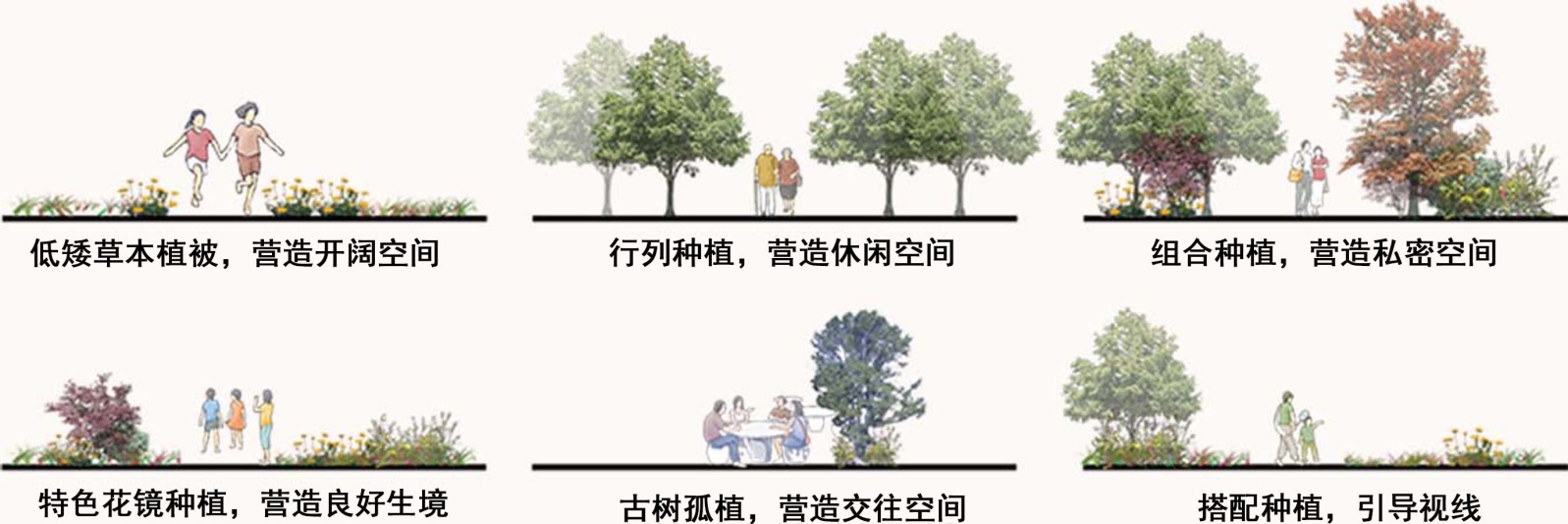 低矮草本植被营造开阔空间:以贴地草本平铺种植,消除垂直遮挡以形成通透无阻碍的视线,适合作为活动过渡区打造开放场景。行列种植营造休闲空间:多选用规整高大的乔木,等距成排栽植。垂直方向的树干用于界定空间边界,水平方向的重复韵律形成秩序感,适合作为休闲活动区。组合种植营造私密空间:通过乔灌草多层搭配,从垂直面和水平面包围空间,创造相对独立安静的环境。特色花镜种植营造生境空间:混合宿根花卉、观赏草、小型灌木,模拟自然群落。古树孤植营造交往空间:以单株大树为核心,使其成为视觉焦点,是人群进行聚集交流的情感联结空间。搭配种植营造引导空间:利用植物高低、疏密变化引导人流走向特定区域,同时通过植物过渡柔化边界,让空间转换更加自然流畅(图16)。