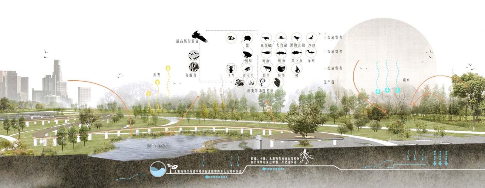 雨洪管理设计以“渗、滞、蓄、净、用、排”为原则,构建海绵体系。本设计中滨水区域的雨水下渗至土壤时通过铺设透水铺装、打造下凹式绿地、保留自然土壤渗透层等措施,增强地表对雨水的吸纳能力,使降水直接渗入地下补充地下水,同时减少地表径流总量,降低城市内涝风险,兼具改善土壤与净化雨水的生态效益(图17)。