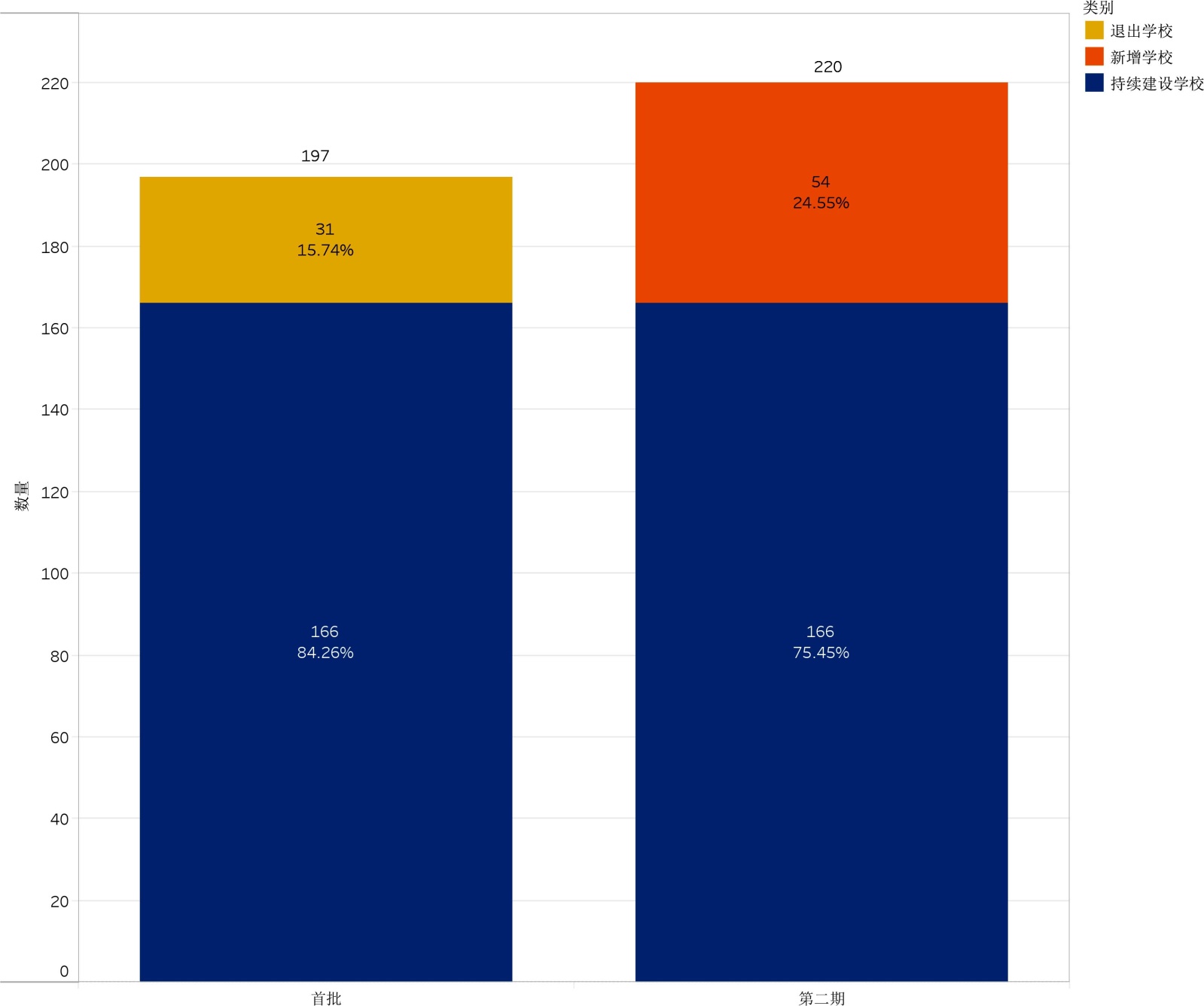 “双高计划”实施四年来,建设规模稳步扩大。见图1所示,第二期学校总数达到220所,比首批的197所净增加23所,增长率为11.68%。这种适度增长体现了双高计划“稳定规模、提升质量”的发展思路[7]。持续建设的学校有166所,占第一期学校总数的84.26%,说明大多数首批建设单位通过了周期考核,保持了建设资格,而超过80%的通过率也保证了政策的连续性和建设稳定性。新增学校54所,占第二期总数的24.55%,“双高计划”的扩容对其他优质高职院校提供了发展机会,为“双高计划”注入了新鲜血液;退出学校31所,占首批总数的15.74%;对部分院校的调整,体现了动态调整的筛选机制,强化了优胜劣汰的竞争导向。规模扩张与结构优化并行,推动优质资源集聚与区域布局均衡,进一步提升了高职教育整体服务能力。