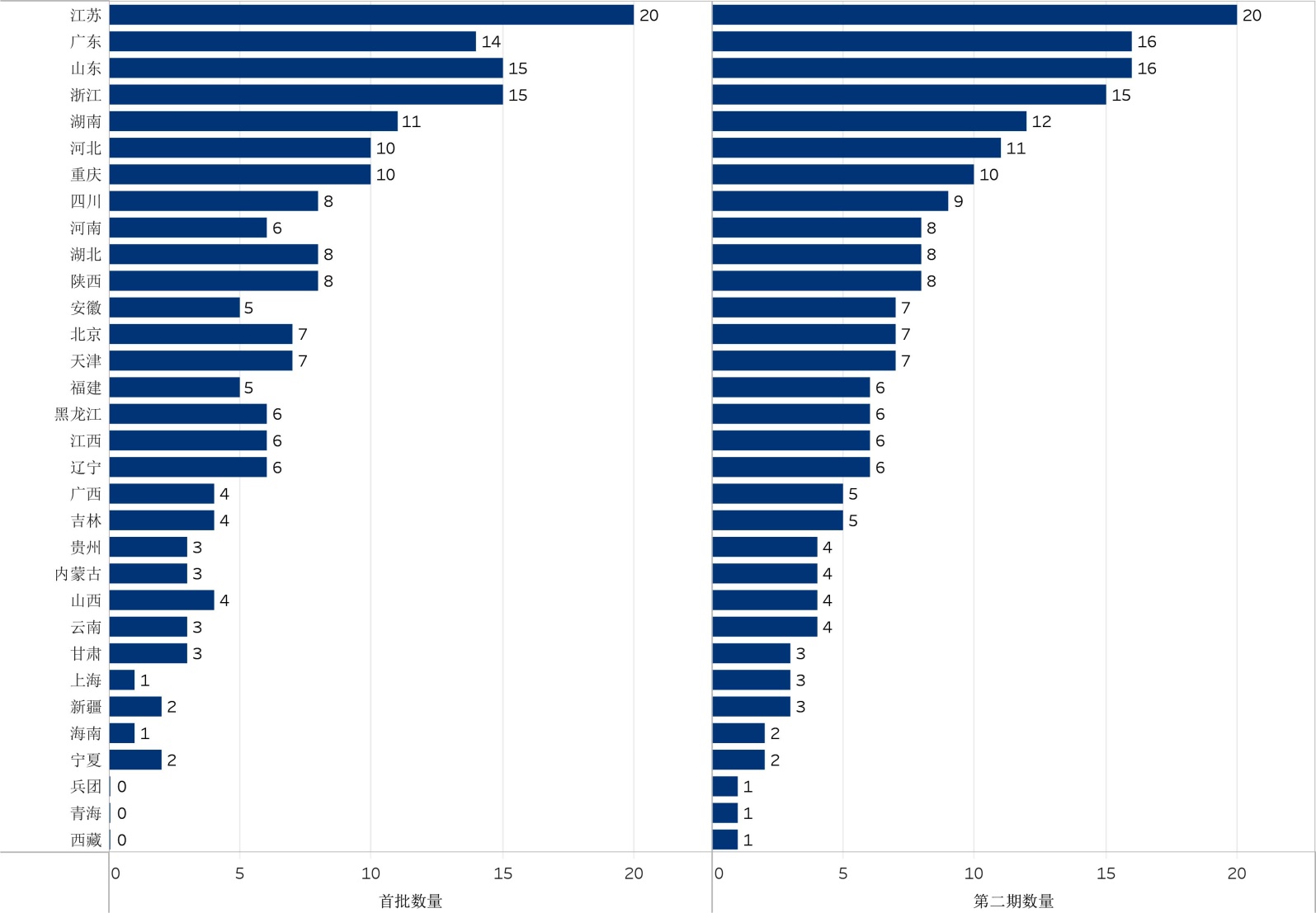 “双高计划”学校数量在全国各省、自治区、直辖市及新疆生成建设兵团(下文简称“省域”)的分布存在明显差异。如图2所示,江苏省以20所位居全国首位,展现了其职业教育强省的地位,广东省(第二期16所)、山东省(第二期16所)、浙江省(15所)紧随其后,这些省域都是经济发达地区和职业教育资源丰富地区。相反,西部地区如西藏自治区、青海省、宁夏自治区等学校数量相对较少。这种分布格局与各地区经济发展水平、人口规模、职业教育基础密切相关,也能体现职业教育服务区域经济发展的本质特征。虽然反映现实基础差异,但也凸显出区域协调发展的迫切需求。