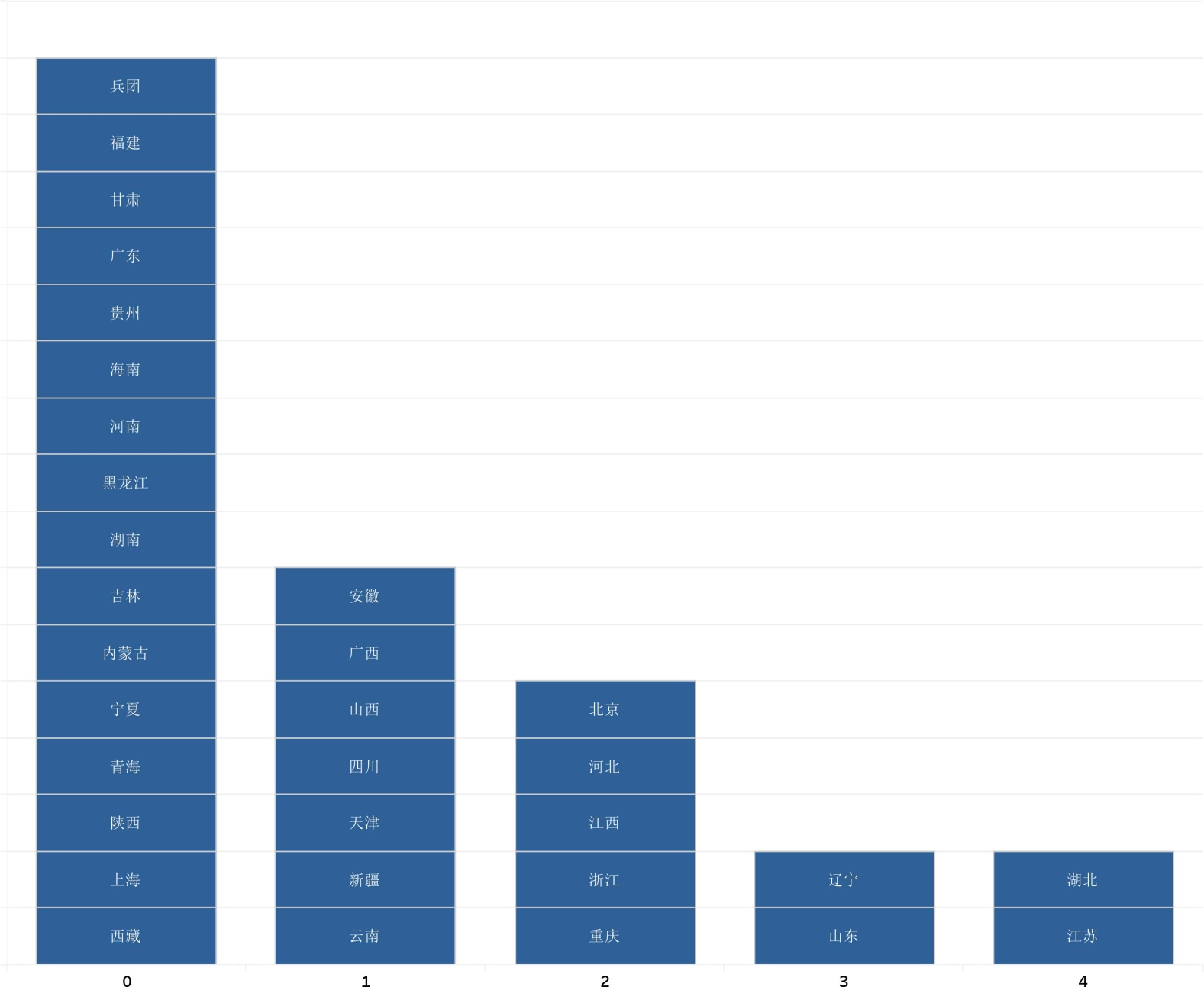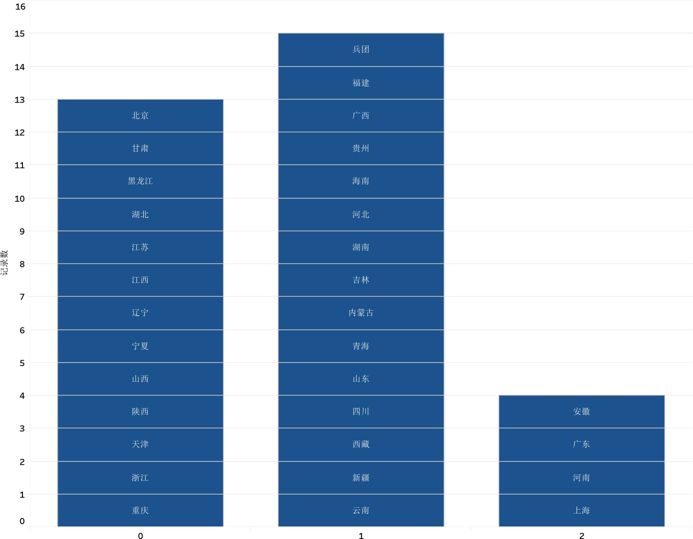 继续分析各省域净增长数量分布,如图3所示,呈离散分布,所有观测值均集中在0、1、2这三个整数上,没有任何省域出现负增长;其中上海、安徽、广东、河南等净增长达到2所;江苏、浙江、北京、天津、重庆等13个省域保持稳定,净增长为0;云南、新疆、四川、青海等15个省域净增长为1。这种数量变化反映了“双高计划”在保持建设规模适度扩大的同时注意区域均衡发展。
