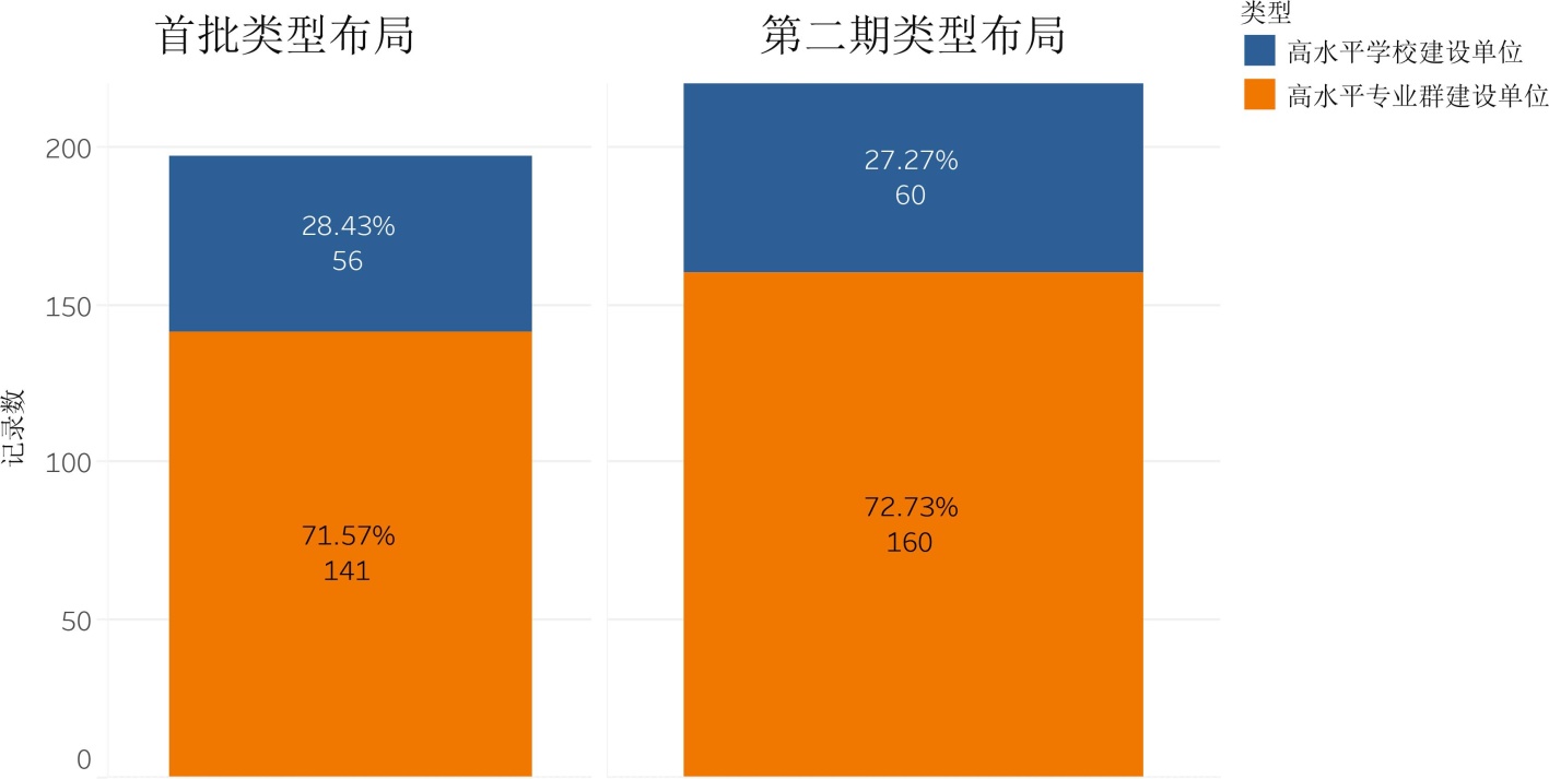 对比两期的布局类型,如图5所示,“高水平学校”建设单位从56扩容到60所,但是占比从28.43%略微降低到27.27%;“高水平专业群”建设单位从141所扩容到160所,但占比从71.57%略微增加到72.73%。整体比例保持稳定,表明政策在扩大覆盖面的同时,对头部学校的扶持力度未减弱,仍坚持扶优扶强与协调发展并重的原则。