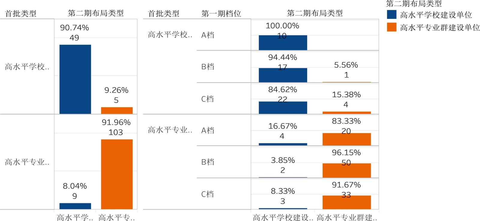 持续入围“双高计划”的建设单位有166所,它们的发展轨迹值得关注。从图9可见,首批高水平学校建设单位在第二期仍保持为高水平学校的有49所,占总量54所的90.74%;掉档为高水平专业群建设单位5所,占比9.26%,其中B档1所,占首批同类同档学校的5.56%,C档4所,占首批同类学校同档的15.38%。相反,从首批高水平专业群学校建设单位升档为高水平建设单位的院校有9所,占首批同类学校的8.04%,其中A档4所,B档2所,C档3所分别占同类同档学校数量的16.67%、3.85%、8.33%。虽然入围持续建设,降档和升档学校数量都有相当的比例,反映出“双高计划”遴选日趋科学化,既保持政策连续性,又打破身份固化,真正实现动态竞争,表明“双高计划”并非一劳永逸的标签,而是强调持续改进与绩效导向。首批和第二期“双高计划”的持续建设,有利于形成累积效应,优胜劣汰的竞争导向又推动职业教育整体水平的提升,持续引导高职院校走内涵式发展道路,提升办学质量与社会贡献度。
