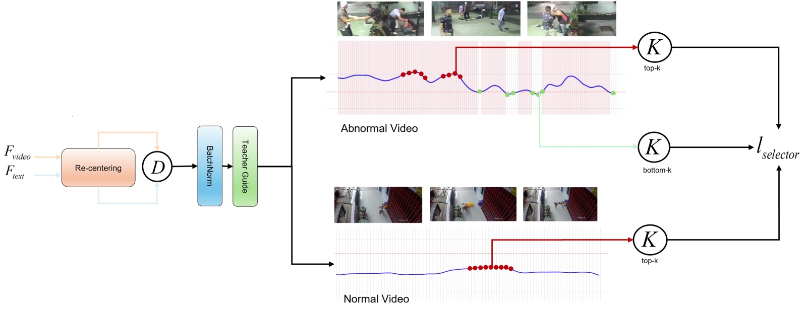 与其他研究仅依赖异常帧的Top-K选择不同,Anomaly Weight Adjuster提出了更精细的Top-K/Bottom-K选择,具体流程见图6。其核心是在帧级语义空间中显式建模异常相关性与样本可信度,并据此进行分层筛选。具体而言,给定视频