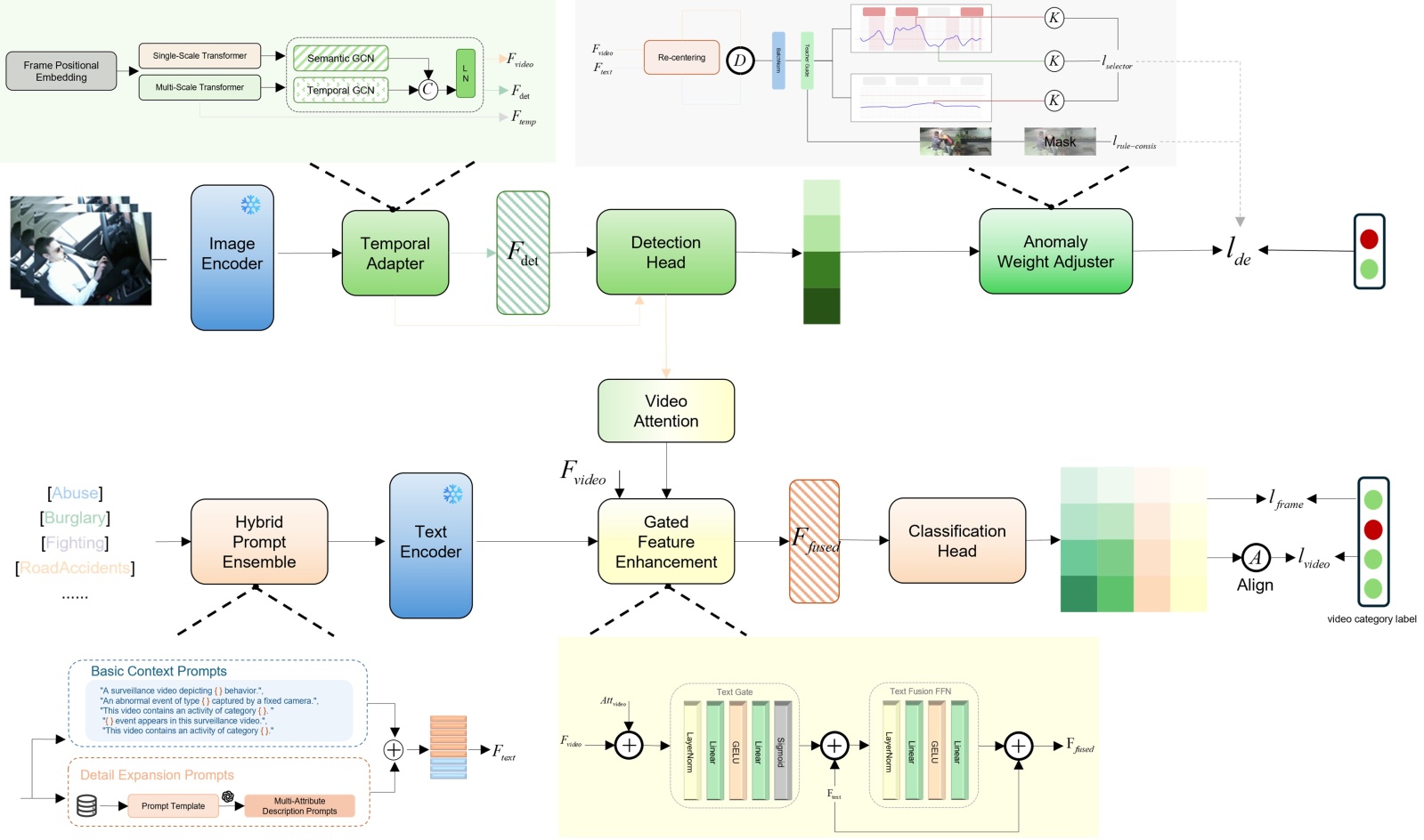 受到近年来,VLM适配下游任务的Prompt-Learning研究启发[9],本文将注意力转向更深层次的文本侧增强与跨模态一致性建模,并提出了一个全新的框架SAGE-VAD (Semantic-Augmented & Guided Enhancement for VAD),图1为SAGE-VAD的网络结构框架示意图。