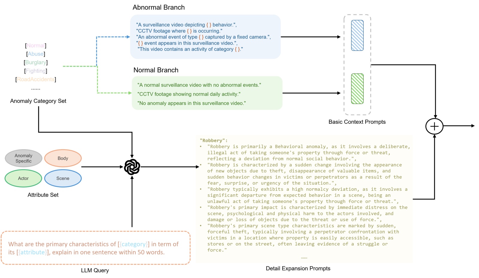 个Prompt,同时包含人工模板Prompt与LLM生成的语义Prompt,用于覆盖异常行为的多维语义表达。利用CLIP文本编码器