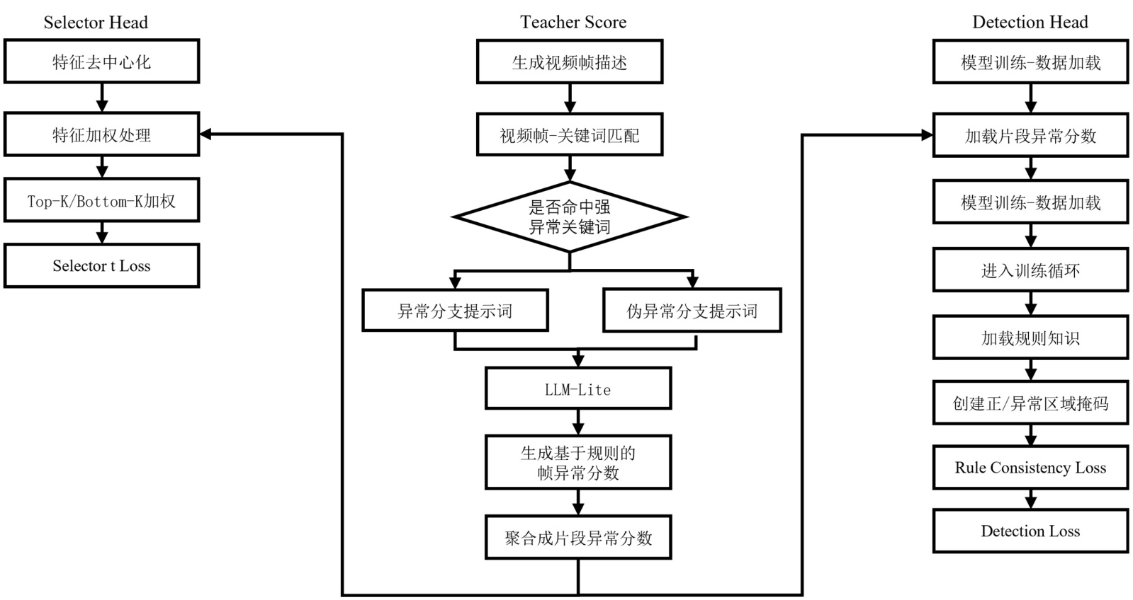 表示该帧在规则层面更可能与异常事件相关。与直接使用规则结果进行硬判决不同,Teacher Score仅作为软可信信号,用于引导模型的帧级语义选择过程,详见图4。