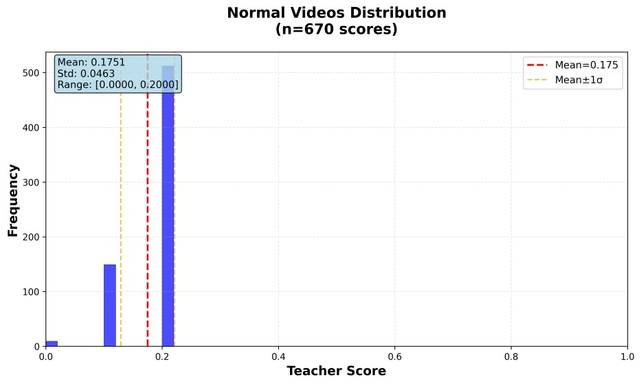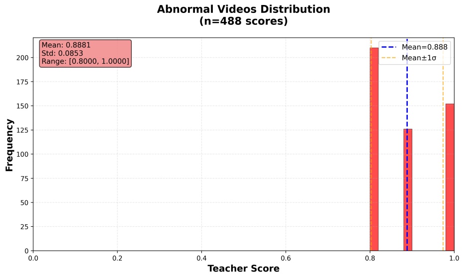 本文对正常视频与异常视频中生成的Teacher Score进行了分析。如图5所示,在正常视频中,大多数帧的Teacher Score集中分布于较低区间,表明规则系统倾向于对正常行为给出较低的异常可信度;而在异常视频中,Teacher Score则显著集中于高分区间,呈现出良好的分布可分性。这一现象表明,基于规则与语义提示构建的分数能够在统计层面有效刻画帧级异常可信度,为模型提供稳定且可靠的先验信息。