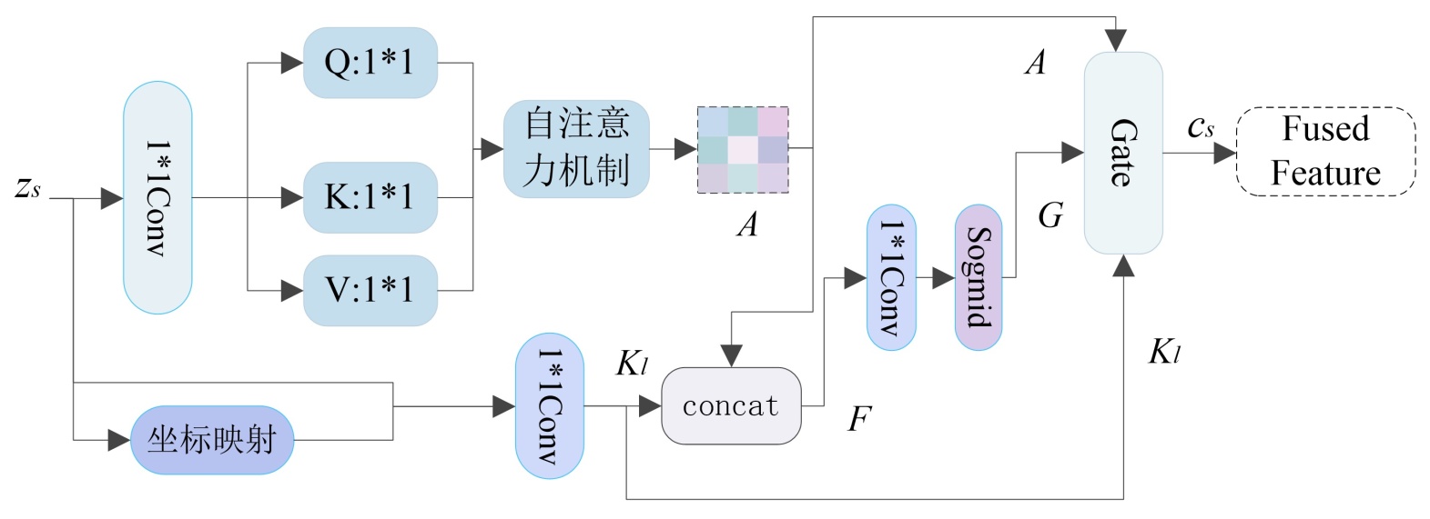 同时,为建模风格特征内部的长程依赖关系,模块并行引入自注意力机制,对输入特征zs分别进行Query、Key与Value映射,并通过注意力权重计算获得全局风格特征表示A。