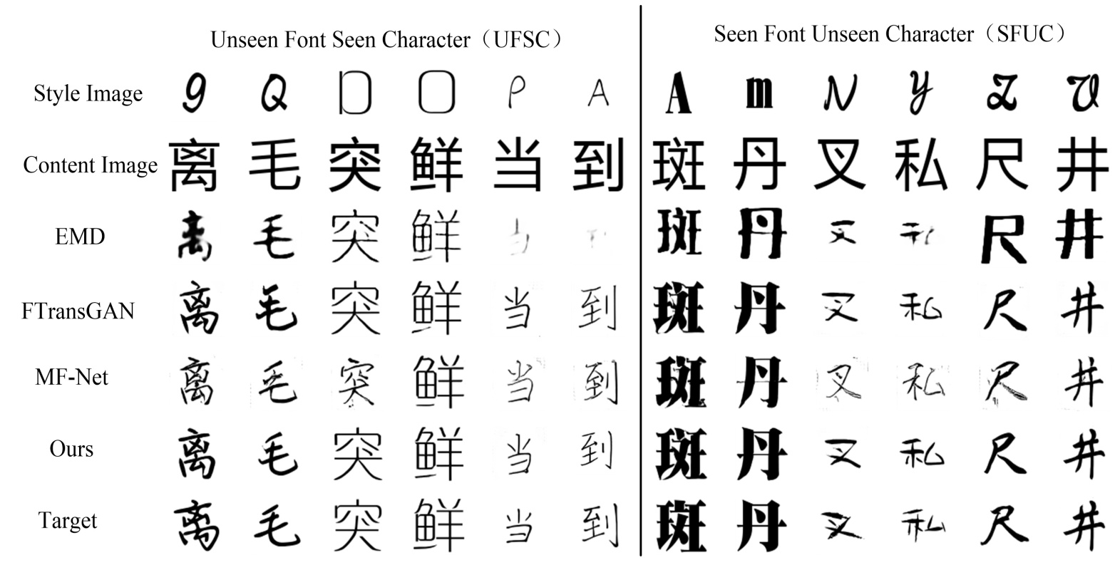 在测试阶段,本文沿用FTransGAN数据集中的两种标准评测设置。未见字体–已见字符测试集(Unseen Font Seen Character, UFSC)包含29种训练阶段未出现的字体样式,每种字体包含1000个中文字符,这些字符类别在训练集中均已出现,用于评估模型在未知字体条件下的风格迁移能力。已见字体–未见字符测试集(Seen Font Unseen Character, SFUC)由训练集中出现的818种字体构成,但在字符层面随机剔除29个中文字符,用以检验模型在已知字体风格条件下生成未见字符的能力。上述两个测试集在字体样式和字符组成上均与训练集严格区分,从而保证实验评估的客观性与公平性。