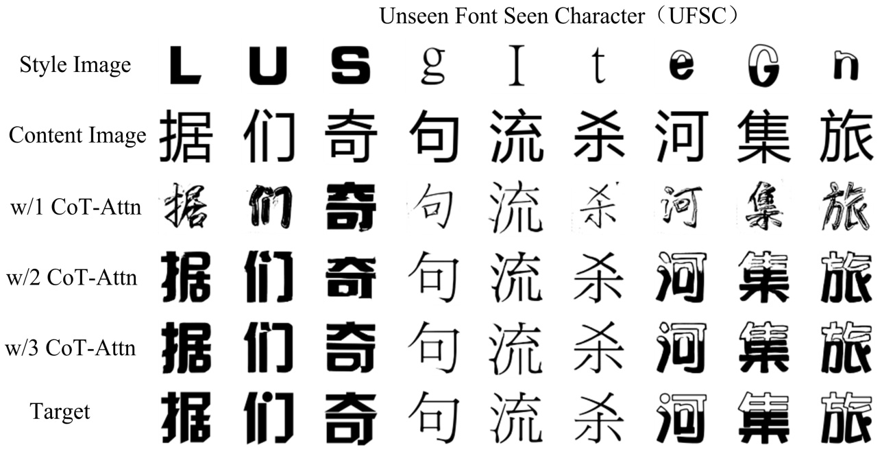 为评估CoT-Attn模块在风格特征提取与迁移过程中的具体作用,本文在UFSC数据集上对其进行了消融实验。实验旨在验证不同层数的CoT-Attn对生成字体的风格表达、笔画连贯性及整体风格一致性的影响。如图4所示,单层CoT-Attn (w/1)虽能引入部分风格信息,但整体风格表达仍不稳定,局部笔画存在断裂与噪声。随着CoT-Attn层数增加(w/2、w/3),生成字体在笔画连贯性、粗细一致性以及整体风格完整性方面均得到明显提升。结果表明,多层CoT-Attn有助于更充分地建模和融合风格特征,使生成结果在UFSC场景下更接近目标字体风格,从而提升风格迁移的稳定性与一致性。