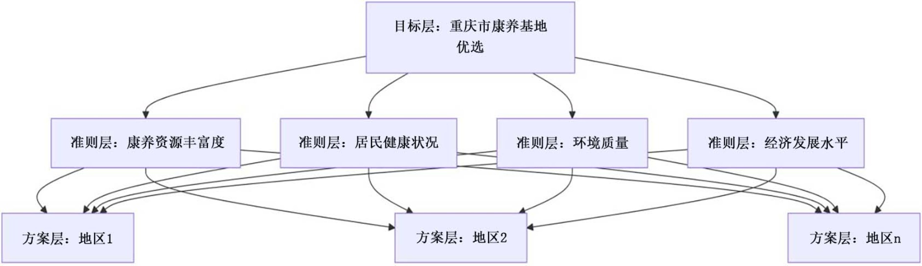 基于上述问题,本文以重庆市为研究对象,围绕康养资源空间分布不均衡与配置效率不足等核心矛盾,构建多维度的康养城市综合评价与优化配置分析框架[1]。具体而言,本文首先从医疗、养老、生态环境、文化资源及健康状况等多个维度构建康养资源指标体系,通过综合资源指数、泰尔指数、区位熵及欧氏距离等方法,对重庆市康养资源的空间分布特征、均衡性及资源匹配度进行系统分析;其次,综合运用层次分析法(AHP)与TOPSIS方法,对不同区域康养城市建设水平进行客观评价与排序;在此基础上,进一步构建多目标优化模型,运用NSGA-II算法,实现了对康养资源分配计划的高效优化解答,探索在成本约束下提升康养服务覆盖率与资源利用效率的可行路径。