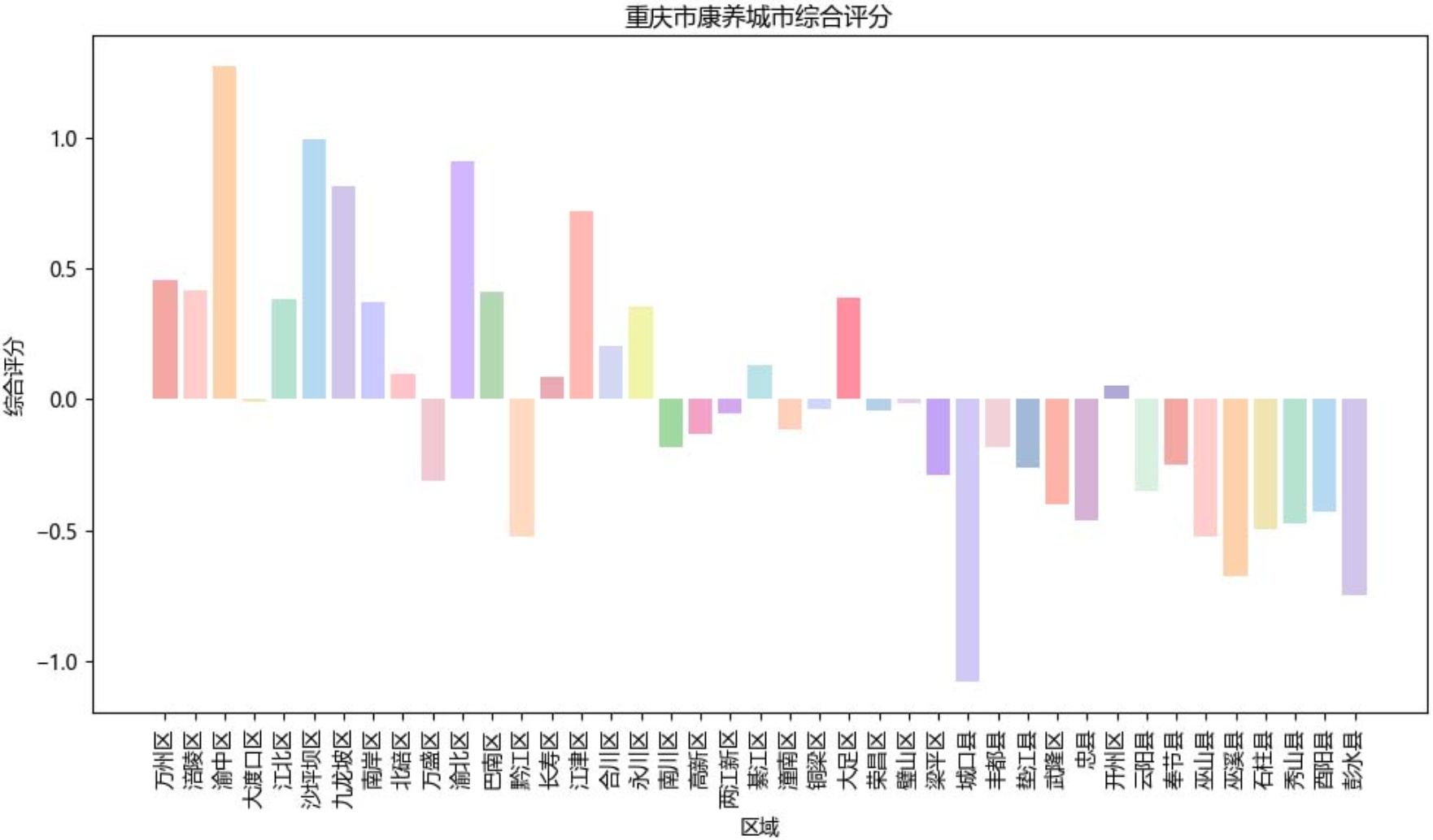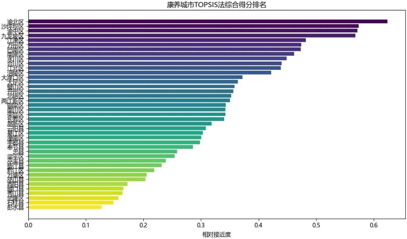 图5中数值代表了各区县在康养资源方面的优先级得分。其中,万州市的得分为0.5780,是所有区县中最高的,说明该区域对康养资源配置的需求最为迫切;而巴南区的得分为0.122,则反映该区的需求不突出。此外,各区县的得分差异较大,如开州区为0.417,显示其需求相对较高,而渝中区和南岸区等地的得分则0.3左右,介于高需求和较低需求之间。这个图表清晰地反映了不同地区在康养领域的需求差异,有利于资源的合理配置与优化。