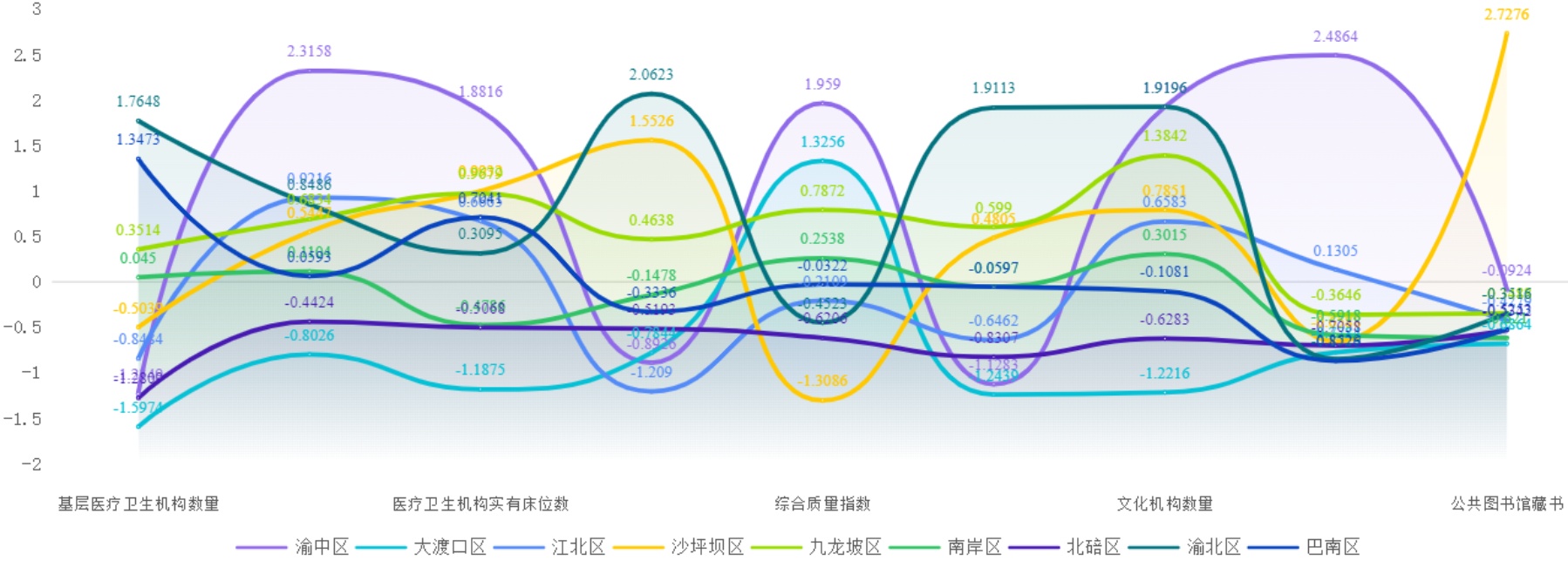 数据分析结果显示,如图1,渝中区在医疗卫生人员配置、文化机构密度及综合质量指数方面处于显著优势,但基层医疗机构数量与公园供给相对不足;相比之下,大渡口区在多数指标上均低于主城区平均水平,资源短缺特征明显;沙坪坝区凭借公共图书馆藏书和养老机构数量成为亮点,但综合质量指数拖累整体表现;渝北区基层医疗机构和公园个数优势明显,而文化机构分布密度是短板。整体来看,渝中区、沙坪坝区属于高资源型区域,大渡口区、北碚区资源不足,其余区域表现较为均衡。