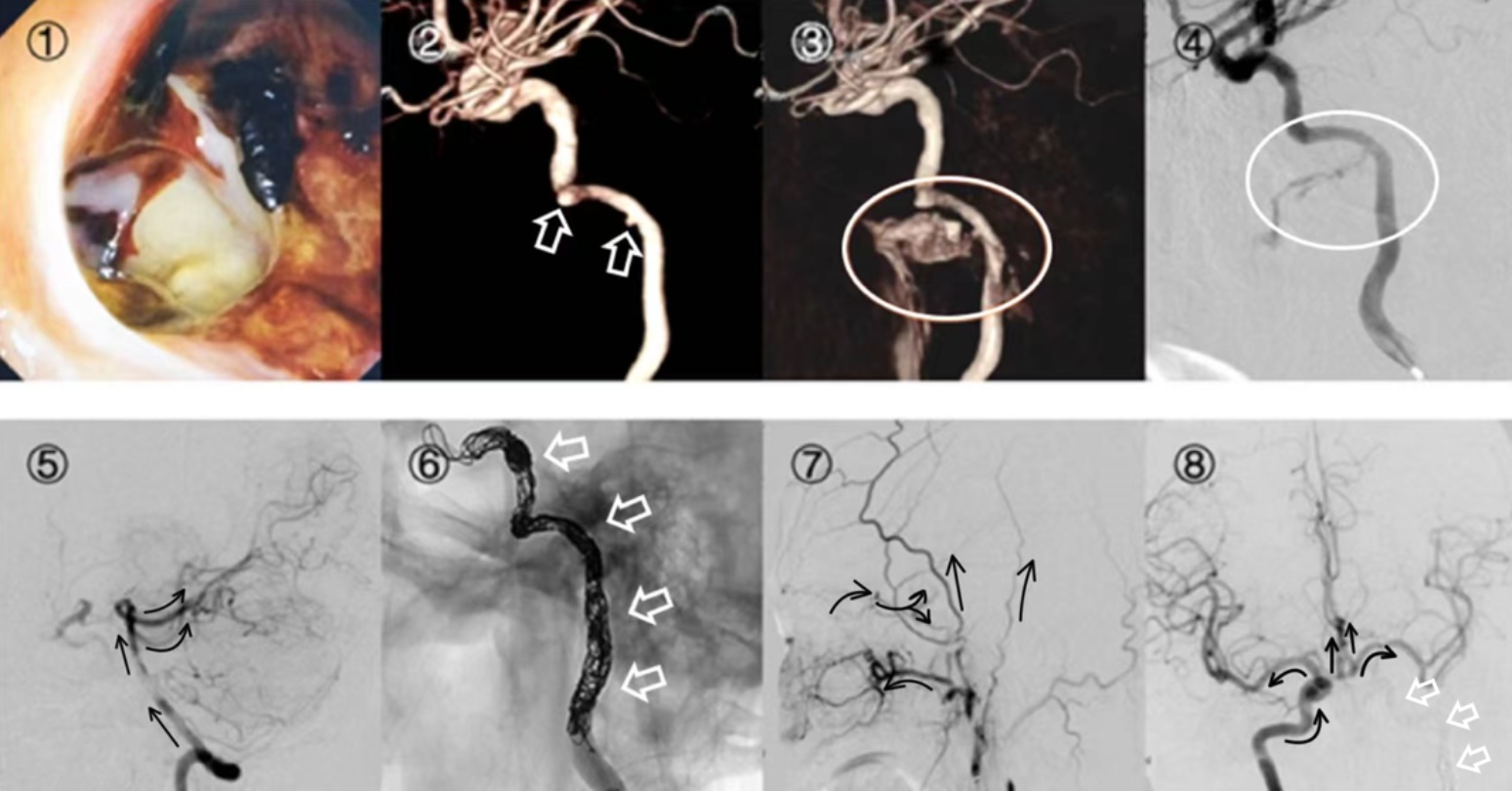 Figure 1. ① Endoscopy of the left nasopharynx; ② First DSA with 3D reconstruction showing a localized protrusion of the left internal carotid artery; ③ ④ Second DSA with 3D reconstruction showing significant contrast leakage; ⑤ Assessment of permanent carotid embolization feasibility with adequate collateral supply observed after intraoperative compression of the left common carotid artery; ⑥ Post-embolization of the internal carotid artery; ⑦ ⑧ Postoperative DSA showing good collateral supply