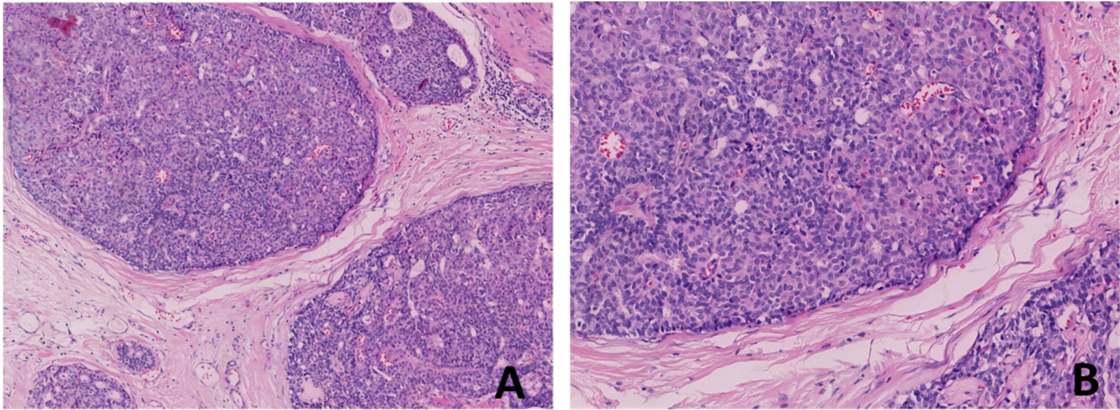 收集2022年6月至2025年8月江苏省人民医院宿迁医院(宿迁市第一人民医院)病理科确诊的乳腺实性乳头状癌(SPC)患者共11例。纳入标准为:经术后病理检查明确诊断为SPC (包括原位型及伴浸润性成分者),且临床与病理资料完整。本研究已获本院伦理委员会批准(批件号:2025-SR-0336),并豁免患者知情同意(因属回顾性匿名分析)。