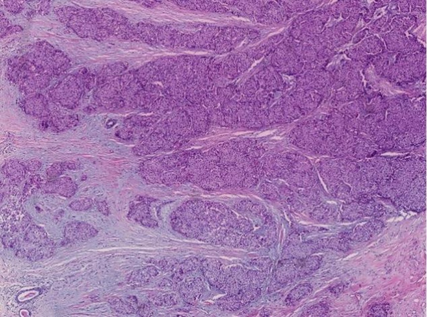 Figure 2. Breast carcinoma, solid papular type, with invasion. The invasive component is characterized by irregularly contoured, geographic or jagged tumor cell nests infiltrating into the surrounding stroma, accompanied by a desmoplastic stromal reaction (HE ×40)