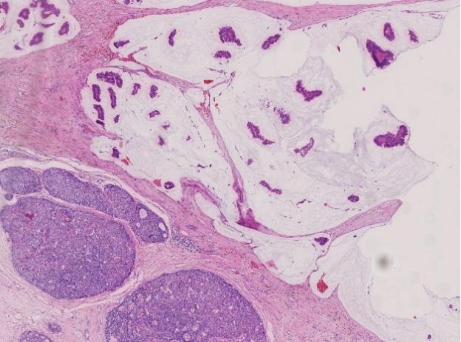 Figure 3. On a background of SPC, a distinct mucinous carcinoma component is identified (HE ×40)