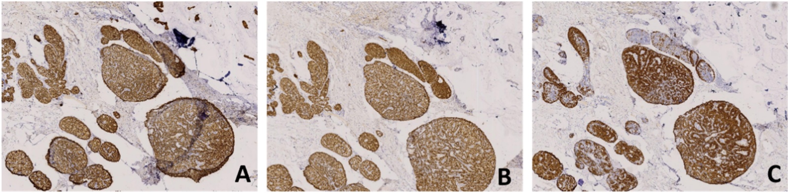 (A) 肿瘤细胞核ER弥漫强阳性表达;(B) 肿瘤细胞核PR弥漫强阳表达;(C) 肿瘤细胞质Syn较弥漫阳性表达。