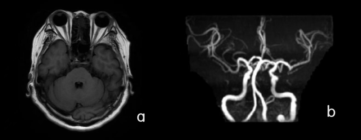 图1. (a) 颅脑核磁平扫;(b) 颅脑MRA