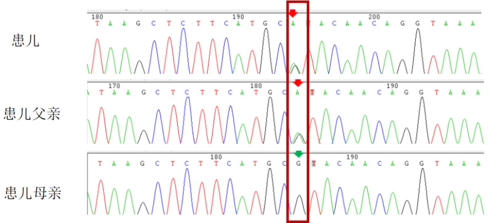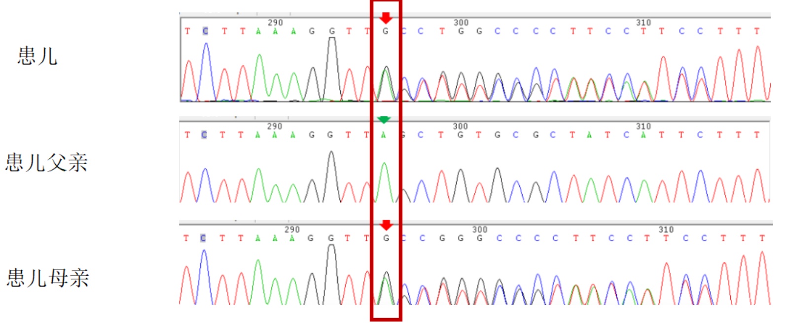 图1. 患儿及其父母变异位点c.338G>A (p.Arg113His) Sanger测序