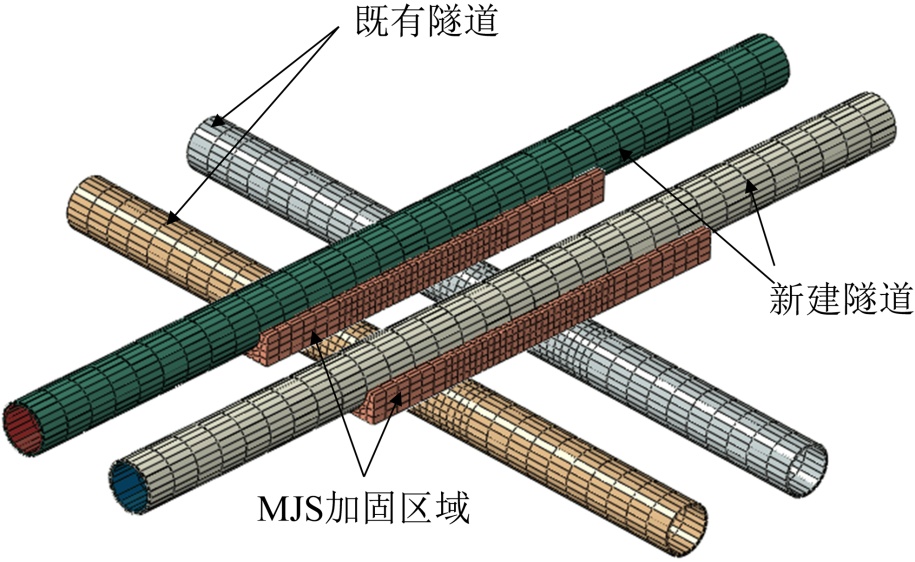 为明确不同施工与加固条件下既有隧道的变形响应特征,本文设置两类计算工况(Case)。其中,Case 1为未考虑既有隧道及新建隧道加固措施的基准工况,用于分析新建隧道上穿施工过程中既有隧道的变形特征及其演化规律;Case 2为考虑既有隧道注浆预加固及新建隧道后加固(MJS工法桩)的实际工程工况,用于模型验证以及后续加固措施对既有隧道最终变形控制效果的定量评估。