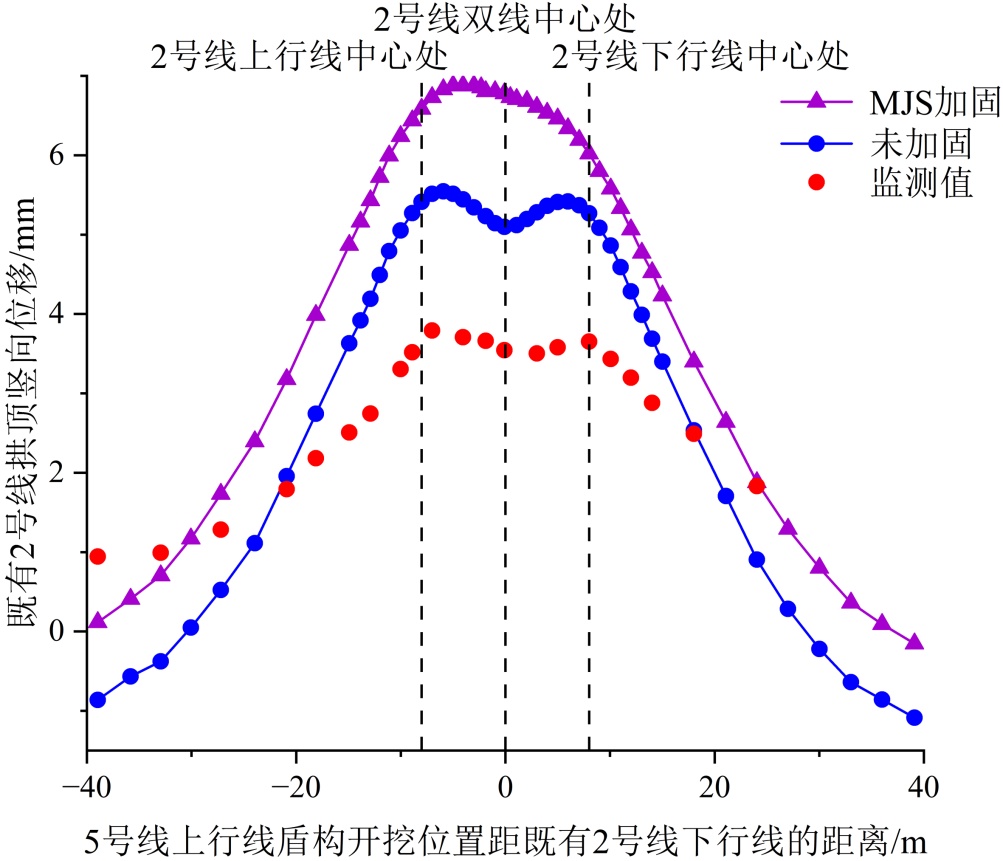 (3) 与未使用加固措施的模拟值相比,加固后既有隧道最终剖面曲线为“M”型的双峰状(即双线中心处隆起小于两侧);而未加固情况下既有隧道的最终剖面曲线为“单峰状”形式(即双线中心处隆起与周围类似)。这说明,新建隧道进行洞内MJS工法桩后加固措施,能有效防止重叠区域既有隧道的整体隆起。
