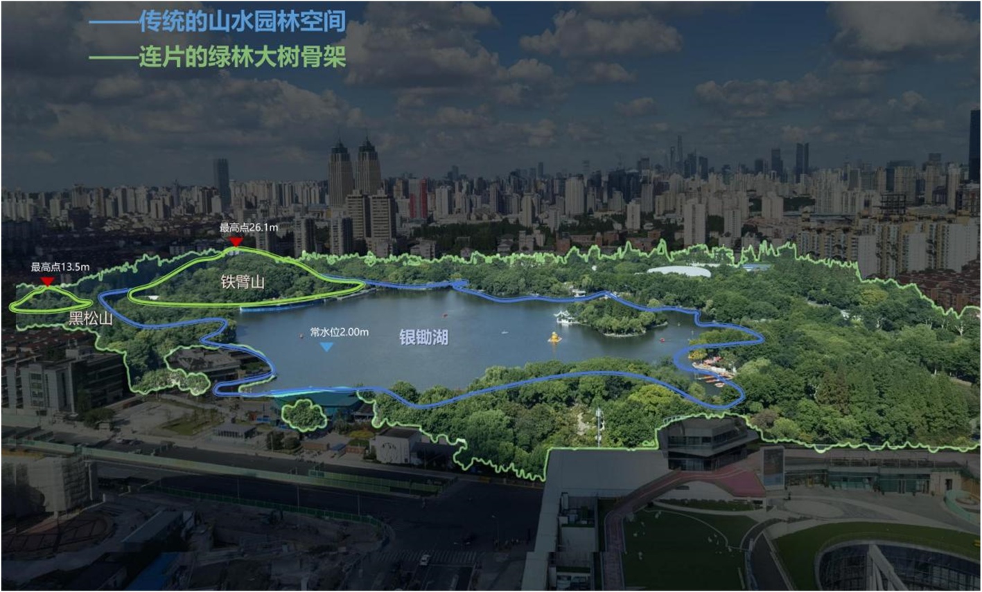 长风公园以银锄湖为核心,以铁臂山、黑松山为依托,形成“湖光山色、山水相映”的景观格局。铁臂山为市区规模宏大的人造土山,黑松山曾以“勇敢者道路”闻名,山水资源具有鲜明的识别性与景观价值,为公园改造提供了良好的自然基底。