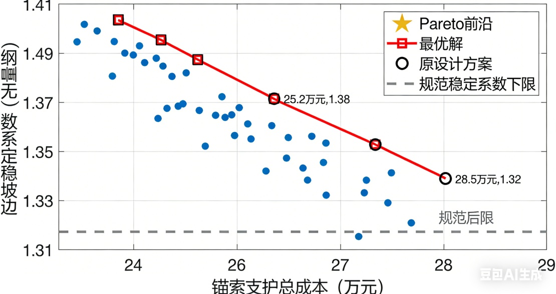 方法创新:采用AHP-NSGA-Ⅱ耦合算法实现多参数优化,权重系数量化可控,最优方案兼顾稳定(Ks ≥ 1.35)与经济(成本降低12.3%),可重复性强。