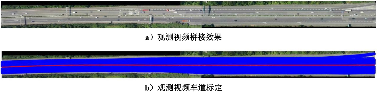 将两台无人机观测采集的视频拼接,并划定车道轨迹,标定匹配坐标以后,提取车辆在道路上的行驶轨迹。视频拼接效果及车道标定见图4所示。
