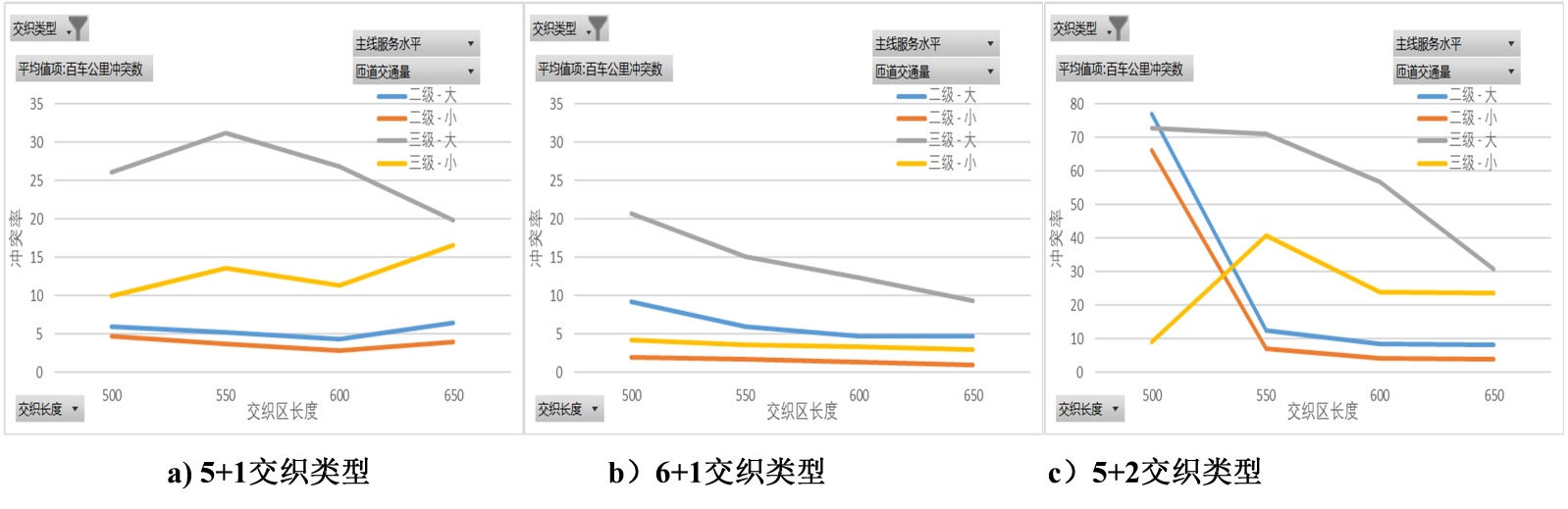 1) 在主线二级服务水平下,除了5 + 2之外,其冲突率随交织区长度变化微小。