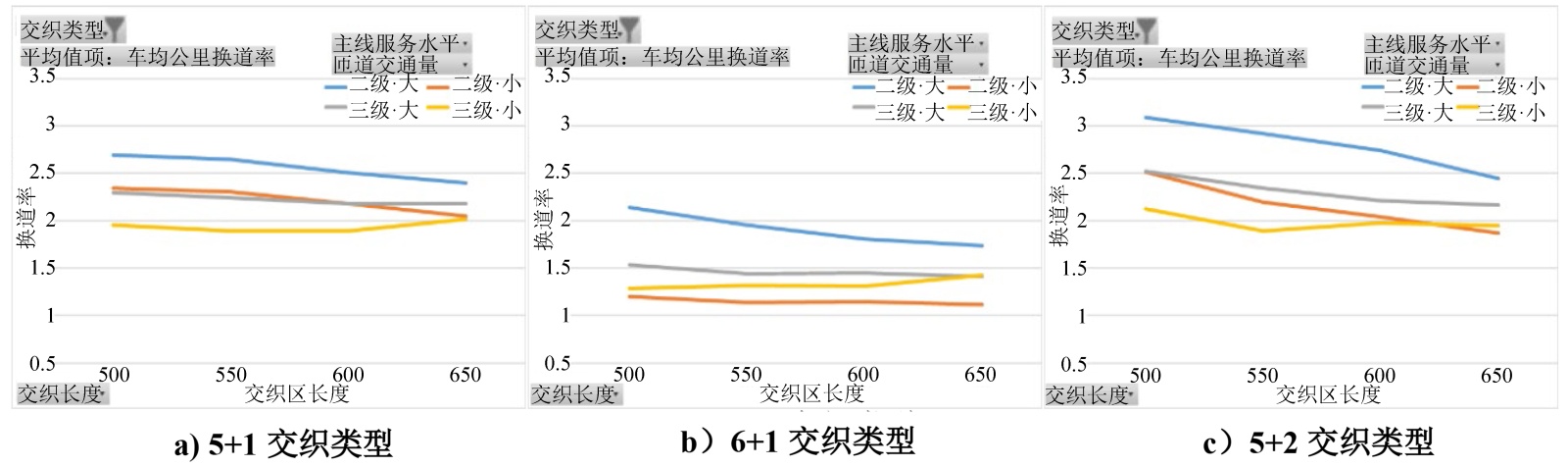 1) 在不同交织区下,换道率呈现基本随着交织区长度增加而下降。