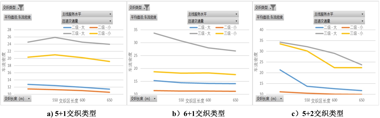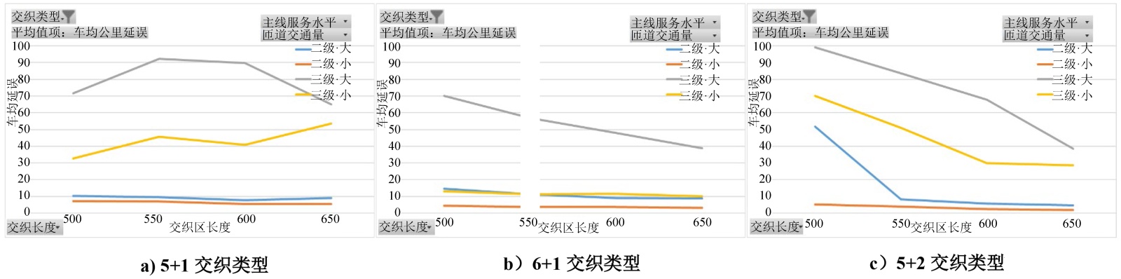 2) 交织区长度与交通量存在非线性耦合关系:高交通量时,长度增加对服务水平的改善作用更显著;低交通量时,过长交织区无法提升安全效益,反而造成资源浪费。因此,设计必须基于实际交通量动态验算,而非采用固定长度标准。