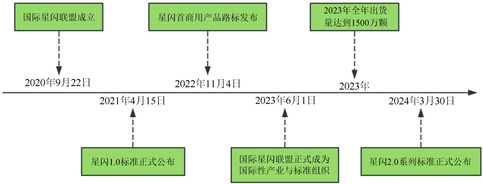 星闪技术最早由华为在2020年的技术研讨会上提出。2020年9月22日,国际星闪联盟成立。2021年,相关通信框架的原型验证完成。2022年11月4日,星闪联盟发布了其首个商用产品路标[11]。联盟联合了芯片、模组和终端厂商共同进行标准化工作,其中包括中科晶上、创耀科技、瑞芯微、海思、移远通信等成员。