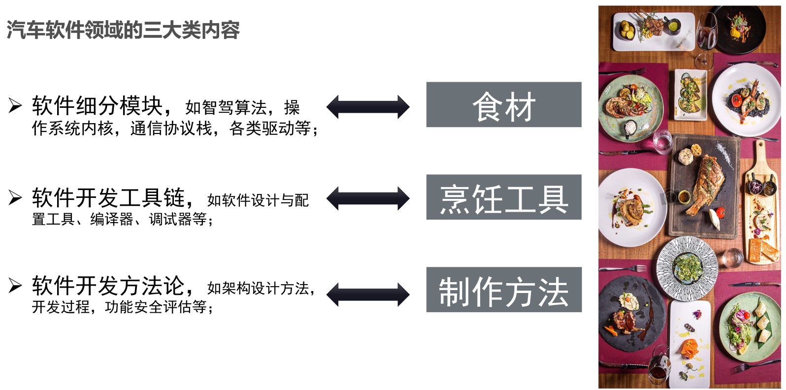 复杂软件系统的开发如同做一桌大餐,丰富多样的食材、专业的烹饪工具和熟练的制作方法三者缺一不可,如下图2所示。车载软件的开发也不例外,要想做出好的汽车软件,需要在软件功能模块、开发工具链和开发方法论三个方面持续精进。