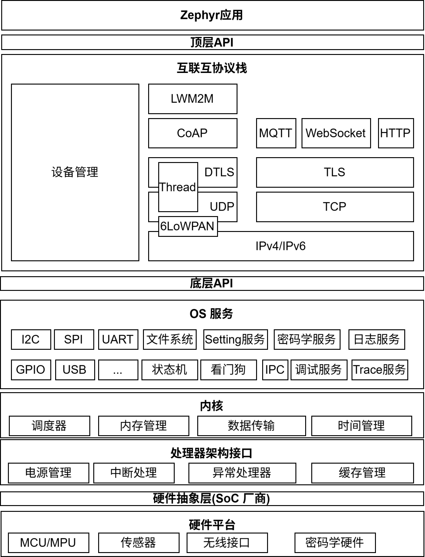 Zephyr并非通用操作系统,而是专为MCU应用设计的轻量级、硬实时、高安全RTOS,同时通过模块化设计兼顾功能完整性。其参考架构图如下图3所示。
