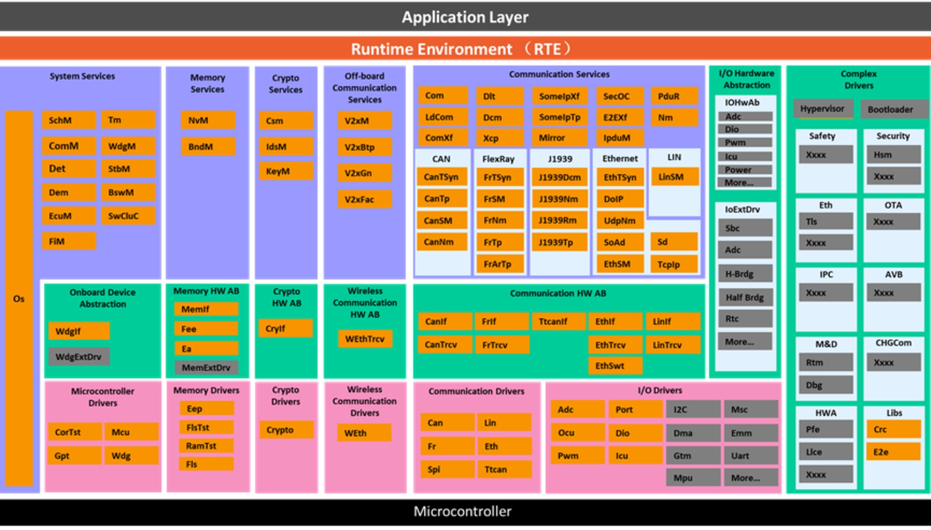 相比上世纪90年代欧洲汽车行业所定义的OSEK标准,AUTOSAR标准为汽车ECU定义了更为完整的基础软件功能。在OSEK已定义的操作系统、通信和网络管理三部分标准的基础上,通过横向分层、纵向分技术栈的架构设计,对约100个模块的实现进行了标准化,如下图中橙色背景的OS、Com、NvM等软件模块。极大地提高了车辆软件组件的模块化、可扩展性和可重用性,并促进了不同系统和技术的集成。如图5所示。