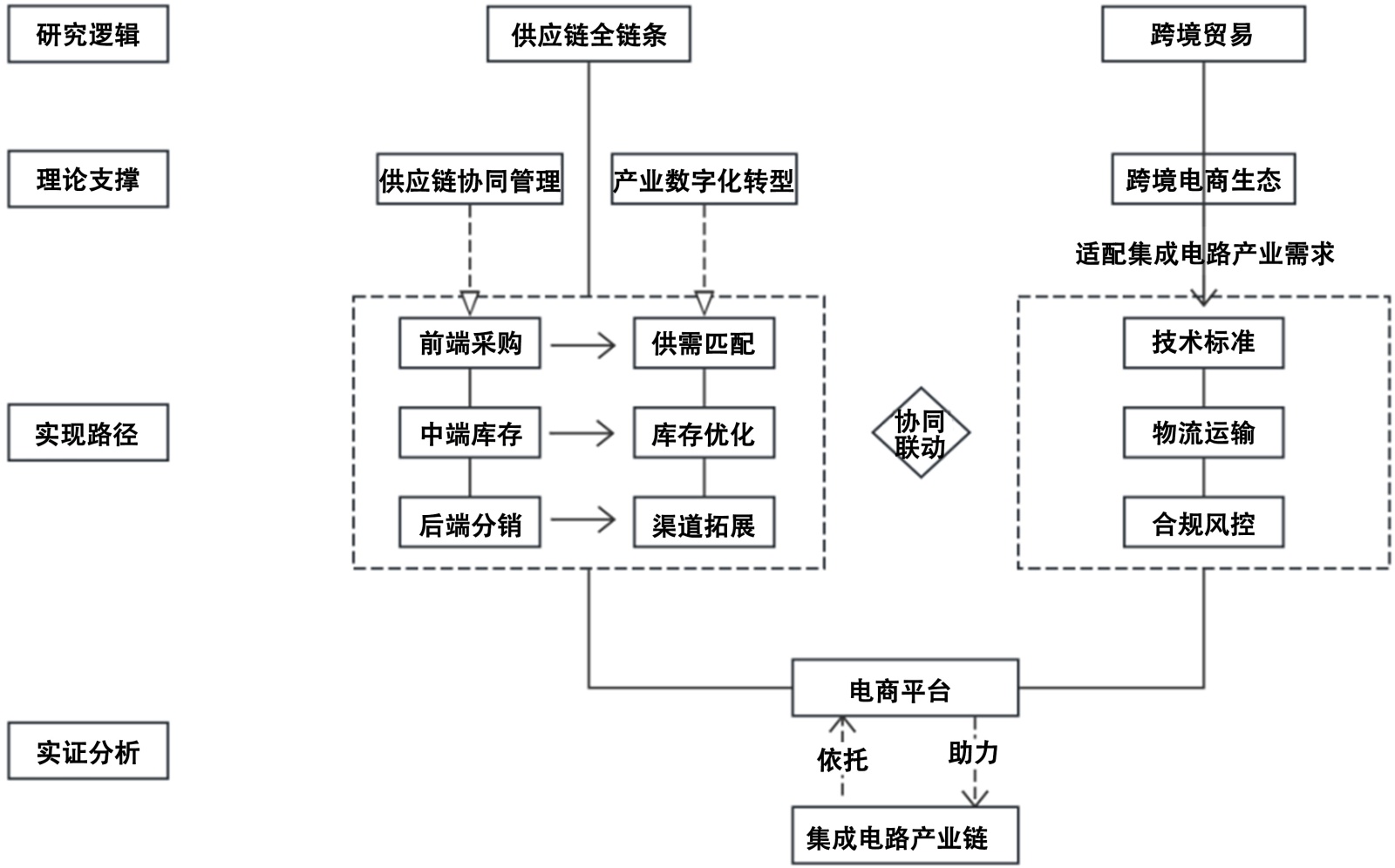 现有研究在供应链数字化、跨境电商及产业协同领域积累了丰富理论与实践成果,为本文聚焦集成电路产业特定场景奠定基础。但现有研究在电商平台、集成电路产业、供应链数字化与跨境贸易创新的多维度协同层面存在显著空白,构成本文核心研究切入点。