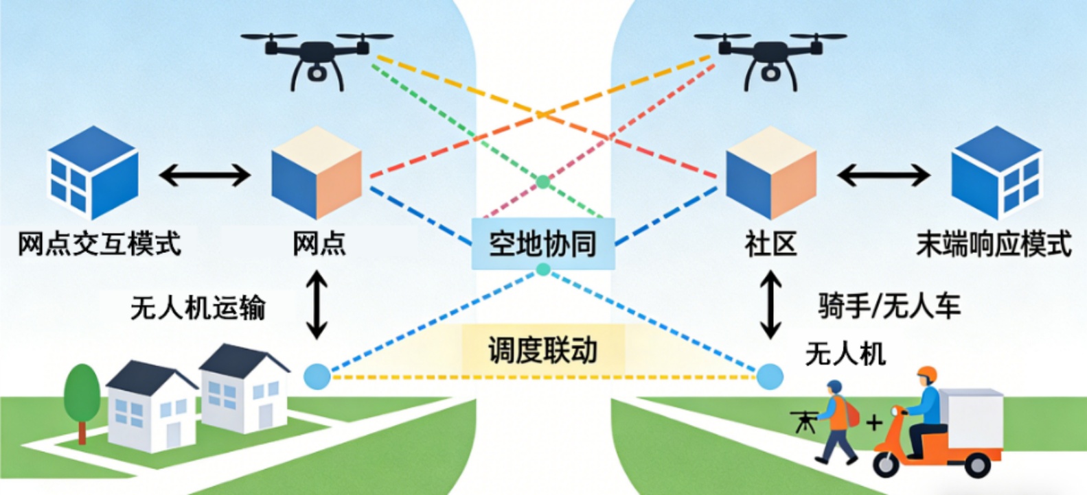 该模式充分利用无人机在时间敏感场景中的优势,同时避免其直接进入人员密集区域进行复杂飞行,从而在效率与安全之间实现平衡。末端响应模式在即时零售、应急物资投送等场景中表现出较高的灵活性和适应性。