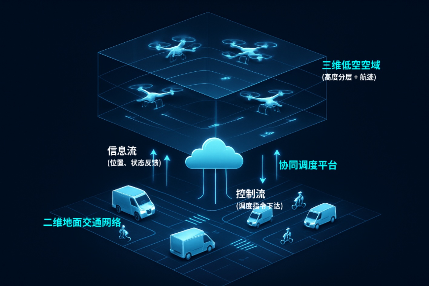 随着研究对象由“单车–单机协同”逐步扩展至城市级运行场景,空地协同配送问题开始从路径优化延伸至空域与地面资源的协同调度层面。在低空经济背景下,无人机配送不再是孤立运行的系统,其飞行轨迹、通信链路与地面交通状态之间存在高度耦合关系,如图2。