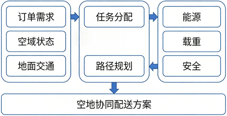 (3) 联合决策机制,通过多目标优化算法,对空地配送任务进行统一调度与动态重构。