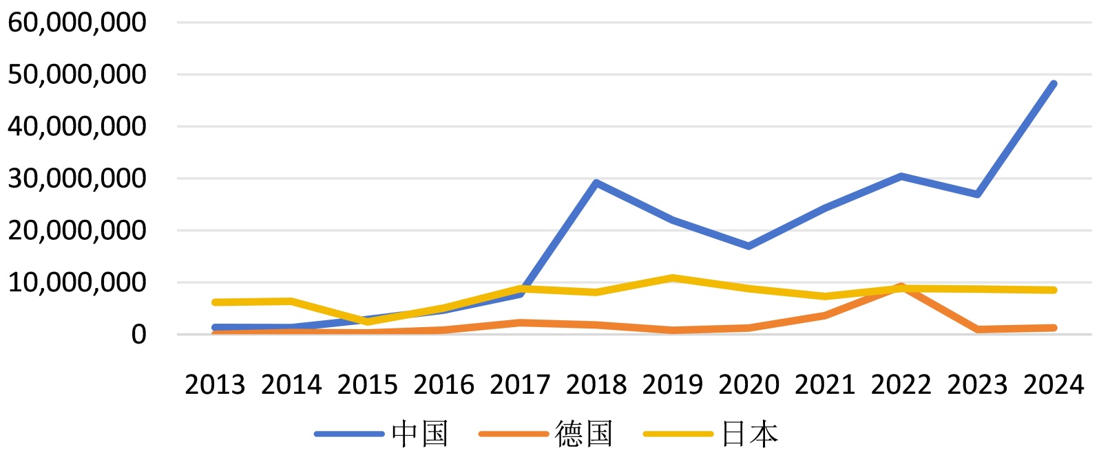 图3. 2013~2024年中国、日本、德国对越南工业机器人出口额对比图
