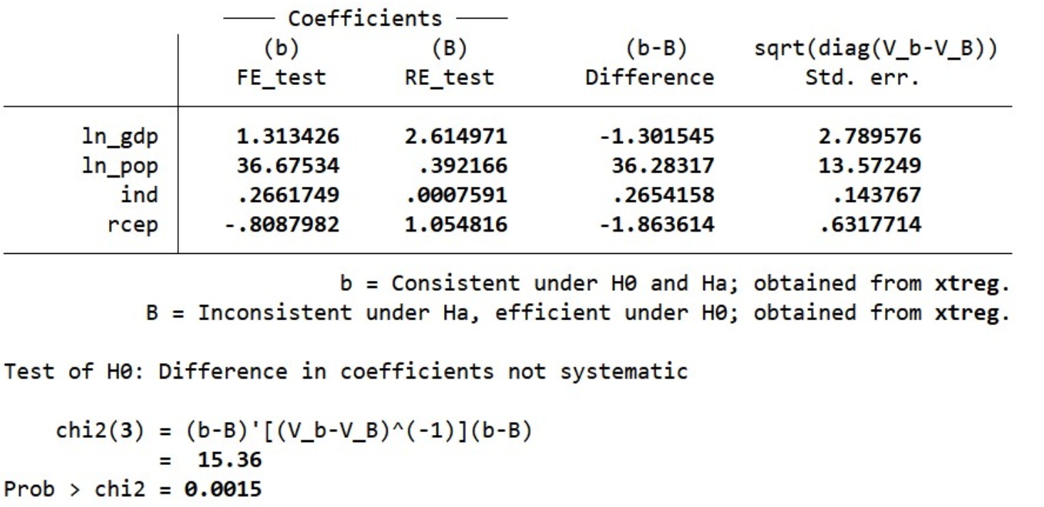本研究通过系统性的计量检验确定最终模型形式。首先根据图4所示,利用豪斯曼检验对固定效应与随机效应模型进行对比甄别。检验结果显示,卡方统计量为15.36且在1%显著性水平上显著,Prob > chi2 = 0.0015,这意味着强烈拒绝“个体效应与解释变量无关”的原假设。该结果揭示国家间不可观测的固有特征(如产业政策差异、技术基础差异等)与核心解释变量存在显著相关性,若采用随机效应模型将导致估计偏误,故必须选择固定效应模型以保证参数估计的一致性。