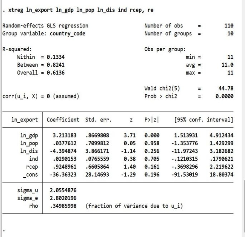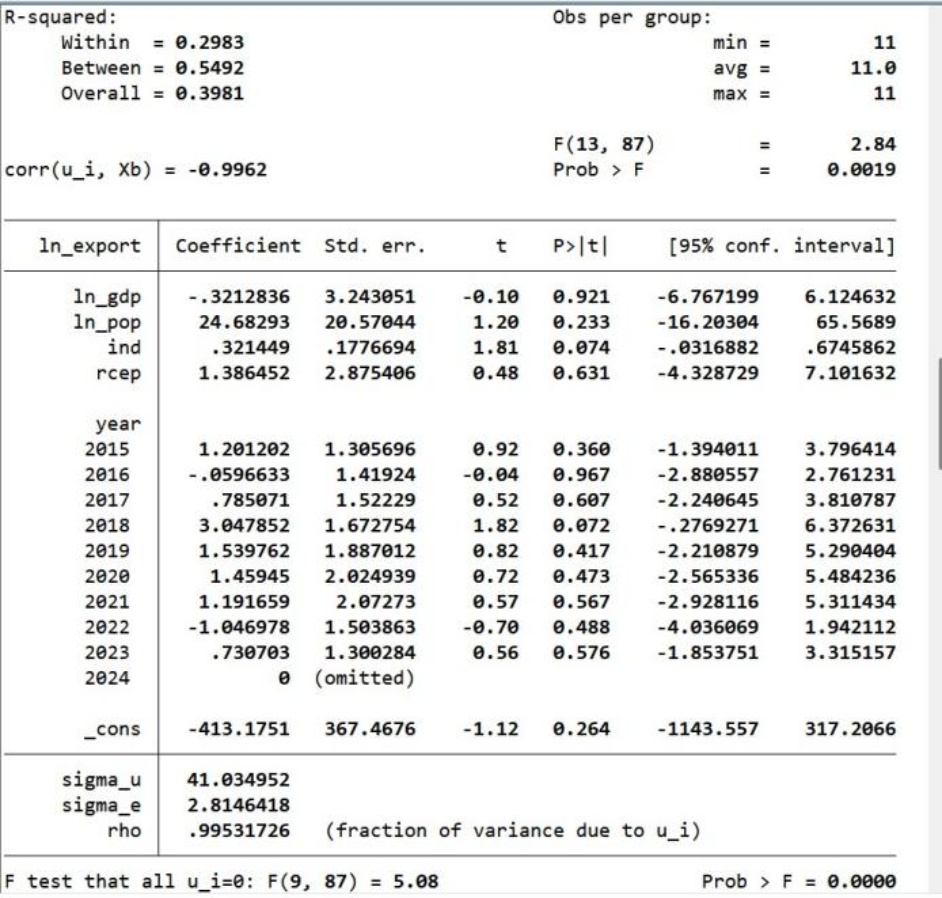 在此基础上,本文确立双向固定效应模型(TWFE)为基准分析框架,该设定一方面,国家固定效应(αj)可吸收不随时间变化的国别异质性特征,如地理距离、制度环境、历史贸易惯性等,根据图5所示,模型中国别差异的方差贡献率高达99.5%,rho = 0.9953,且F检验强烈拒绝“无个体效应”的原假设Prob > F = 0.0000,印证忽略国家固定效应将造成严重遗漏变量偏误;另一方面,时间固定效应(δt)能有效滤除研究期内全球共同冲击的干扰,RCEP生效首年的系数显著为负,β = −1.047,这与新冠疫情引发的供应链断裂现实高度吻合,凸显控制时间趋势对剥离政策纯效应的关键作用。组内拟合优度Within R2 = 0.2983显著高于随机效应模型的组内解释力0.1334,表明双向固定效应更适用于捕捉数据变异规律;个体效应与解释变量的高相关性corr(ui, Xb) = −0.9962则证实模型成功控制了非观测异质性。模型有效性进一步得到统计指标支持。