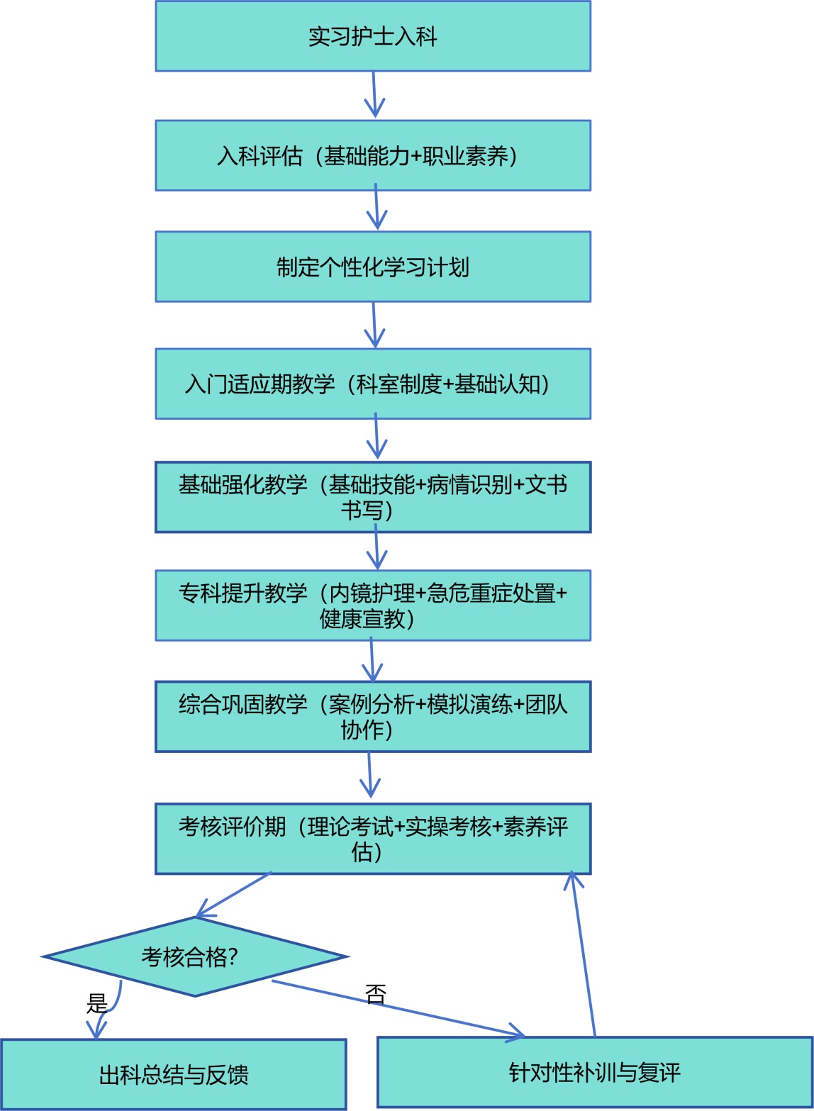 实习护士入科后,先通过入科评估明确其基础能力与职业素养水平,据此制定个性化学习计划;随后依次开展入门适应期、基础强化期、专科提升期及综合巩固期的分层教学,各阶段分别聚焦科室认知、基础技能、专科能力与综合素养的培育;完成阶段性教学后进入考核评价期,若考核合格则开展出科总结与反馈,若不合格则进行针对性补训与复评,形成“评估–教学–考核–改进”的闭环管理,流程见图1。